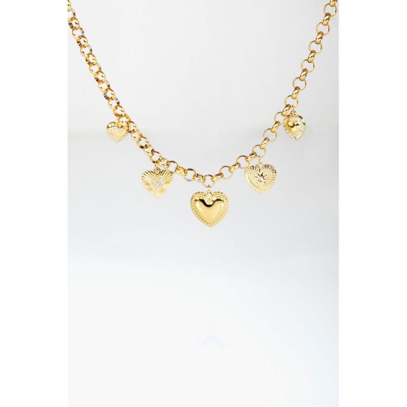 Sa chaîne à larges maillons dorés est ornée de multiples pendentifs cœurs, chacun avec ses détails ciselés ou perlés.