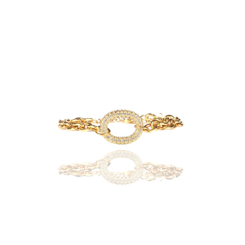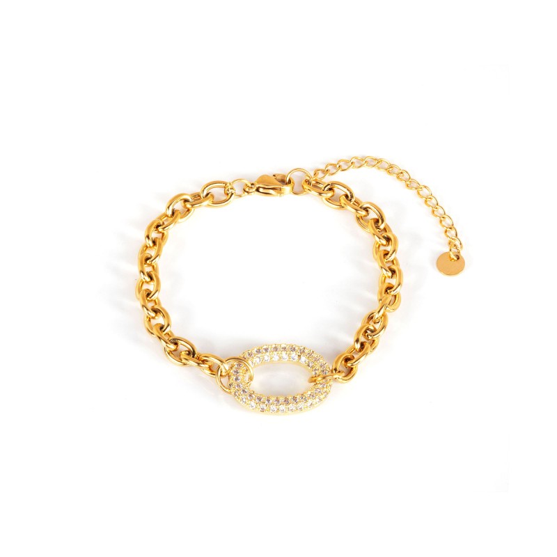 Son maillon central ovale pavé de zircons capte la lumière à chaque mouvement, offrant un éclat raffiné digne des plus beaux looks.