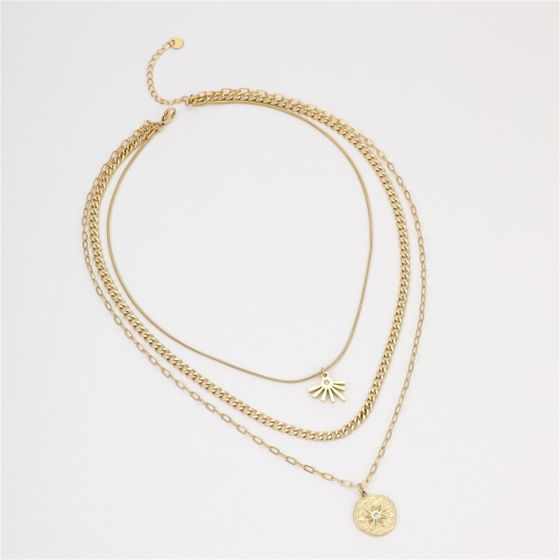 Composé de 3 chaînes de styles différents, il associes finesse, caractère et symboles : une papille en éventail et un médaillon texturé à l'inspiration antique.