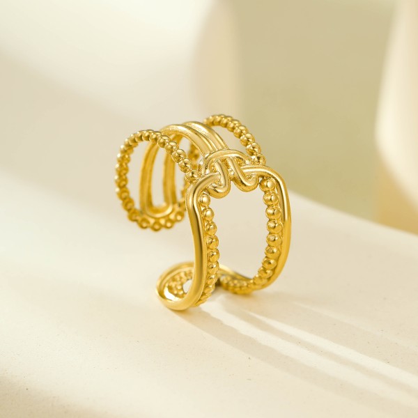 L'art de l'accumulation sans effort. Cette bague dorée ajustable crée l'illusion parfaite de trois anneaux superposés, mêlant finitions lisses et perlées pour un style graphique.