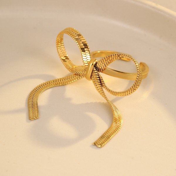 L'illusion parfaite d'un ruban d'or. Cette bague ajustable séduit par son nœud volumineux en maille plate tressée qui capture la lumière comme une étoffe précieuse.