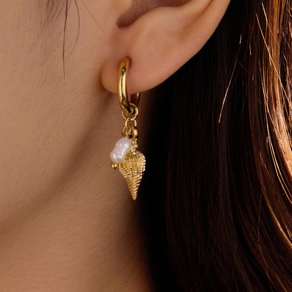 Une pépite marine pour votre collection. Ces mini-créoles dorées captivent par leur charm coquillage sculpté associé à une petite perle blanche, pour un look estival élégant et raffiné.