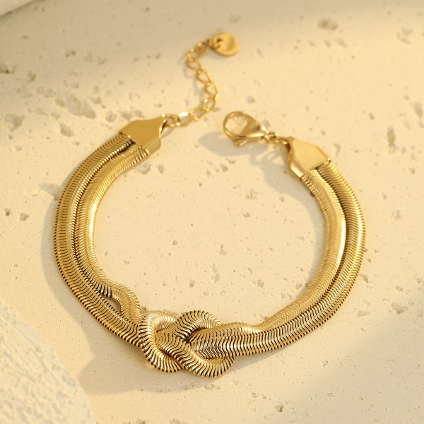 Un flot de lumière à votre poignet. Ce bracelet audacieux en maille serpent plate forme un nœud central volumineux, alliant la fluidité d'un ruban à l'éclat de l'acier doré.