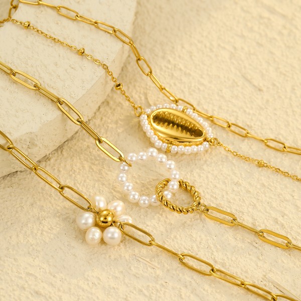 L'esprit bohème chic dans toute sa splendeur. Ce bracelet double rang doré sublime le poignet avec son coquillage cauri central entouré d'une couronne de petites perles blanches.