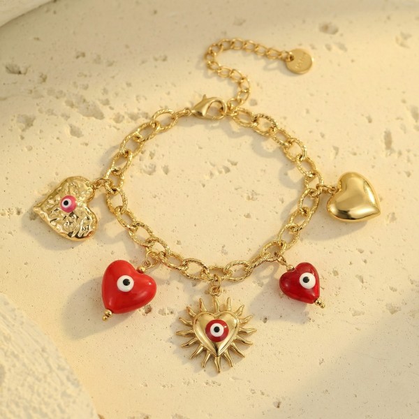 Le bracelet qui fait parler de lui ! Craquez pour cette gourmette dorée ultra tendance, rythmée par cinq charms cœurs qui tintent joyeusement à chaque mouvement de votre poignet. Un concentré d'amour et de style.